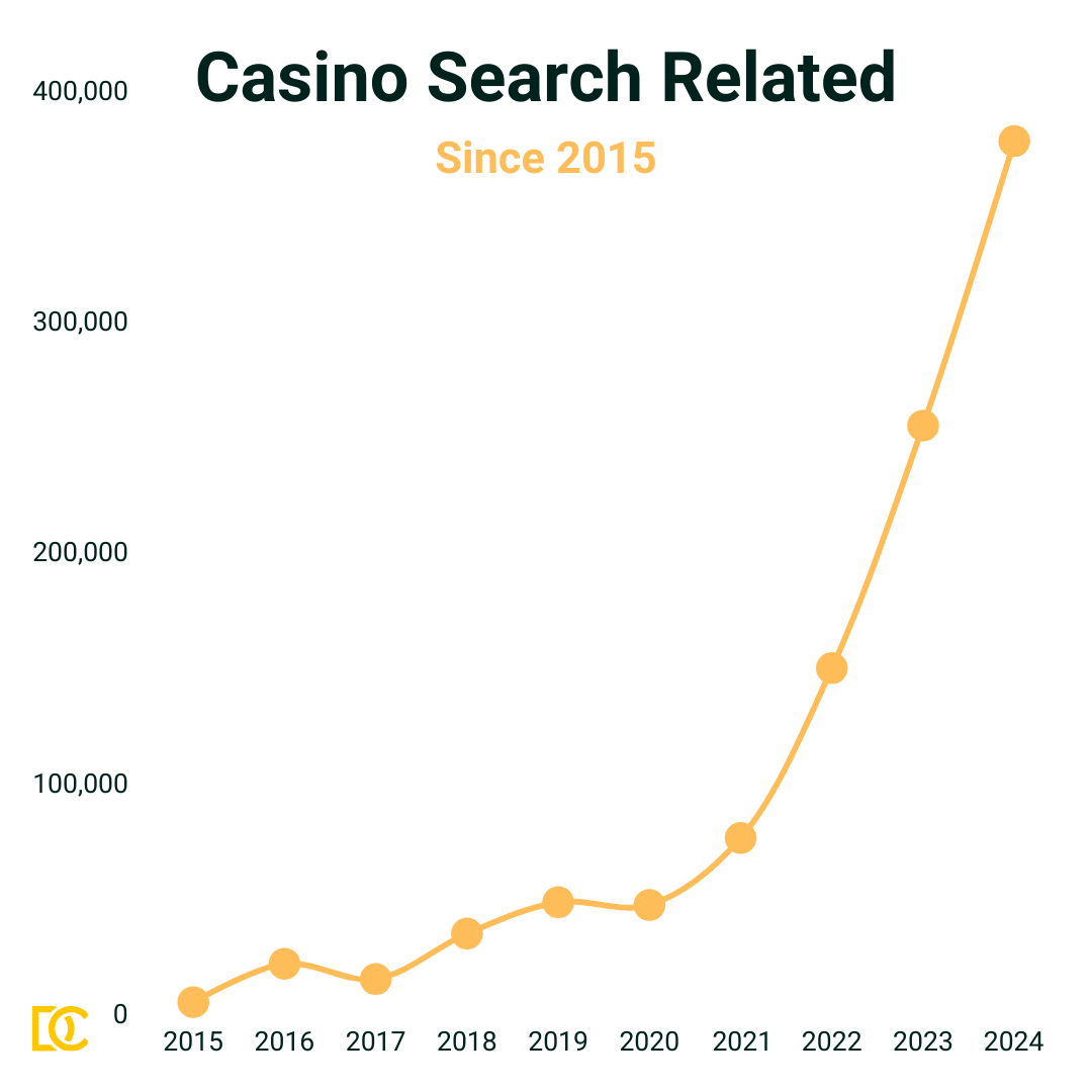 Casino search activity experiences a significant surge of 32.5% year-on-year, signaling increased interest. Anticipated to set a new record in 2024, this growth reflects escalating engagement in the topic.