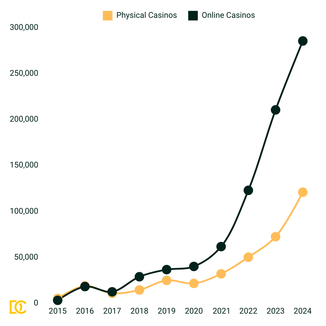 While the growth rate for physical casino searches is lower compared to online casinos, there is still a significant uptick of approximately 430% from 2015 to 2023.